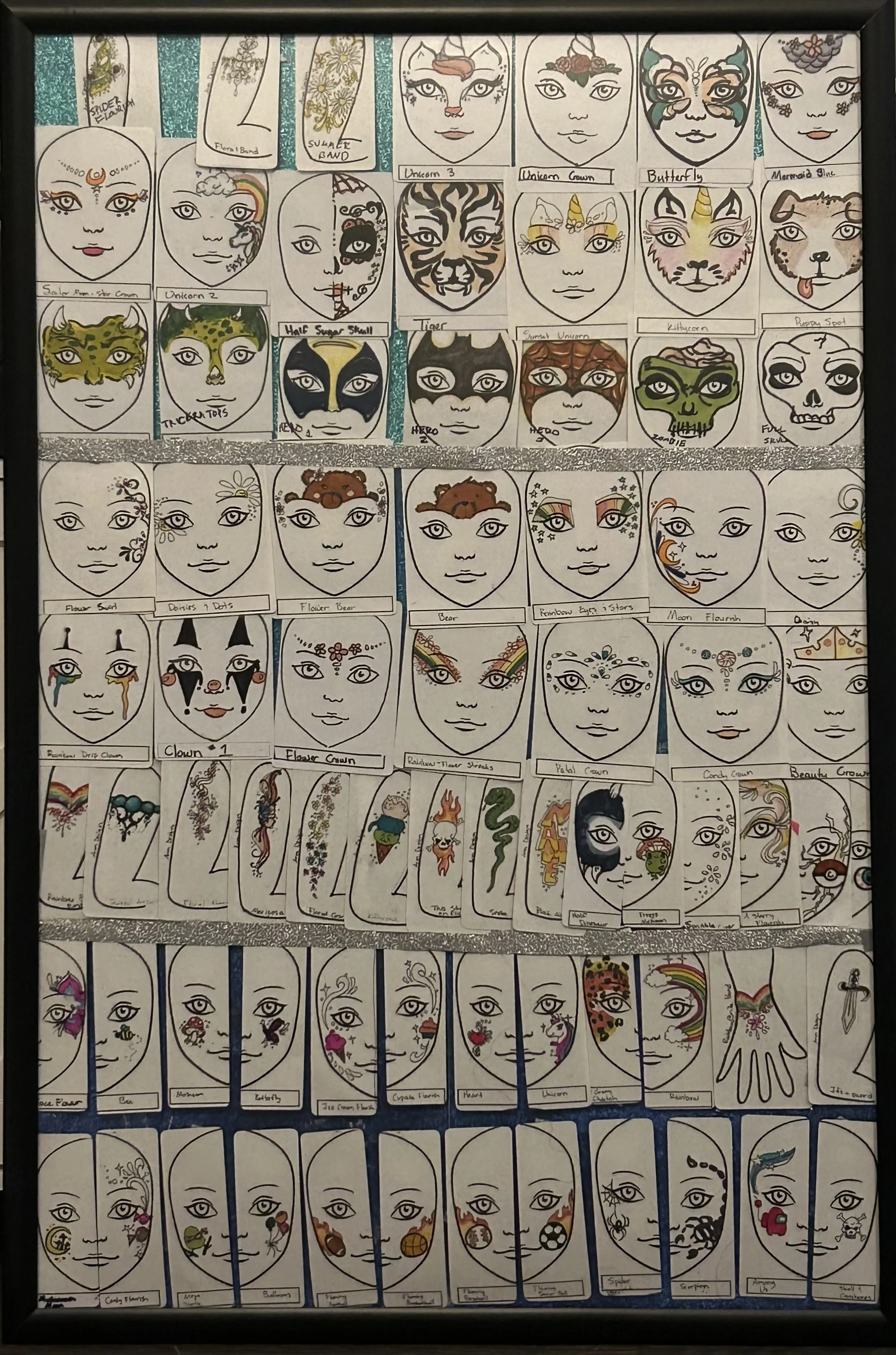• Board A: Mixed selection of cheek, half-face, and full-face designs, optional glitter. (Average of 23 faces)